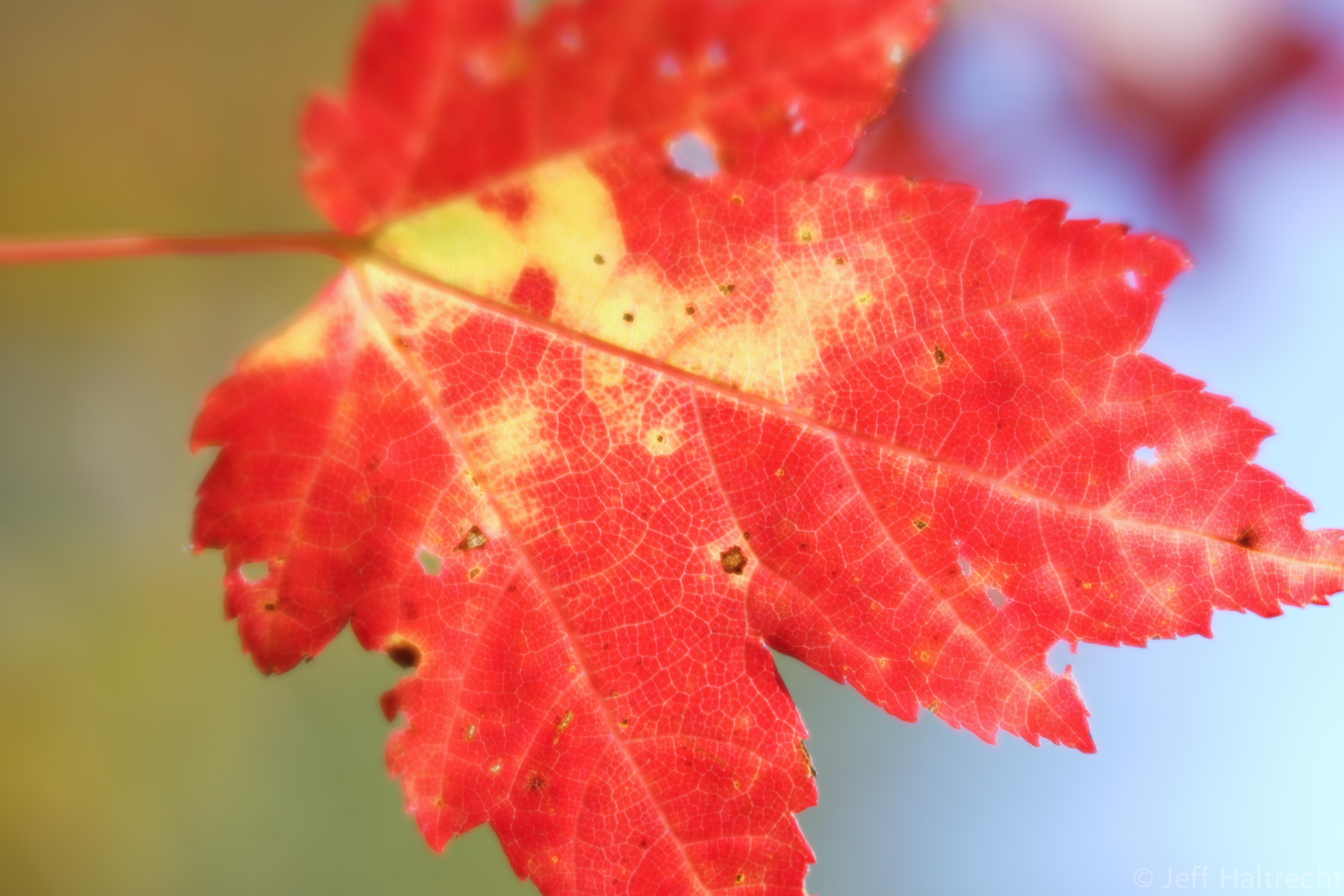 A ‘real life’ view of the Canadian flag’s maple leaf at the beginning of fall. The photo was taken using the new Lensbaby Velvet 56 lens in macro mode, creating a soft ethurial effect and completely blurring out the background (in case you are wondering why it does not appear in focus). The soft blue is a lake, while the yellow tint are other leaves.