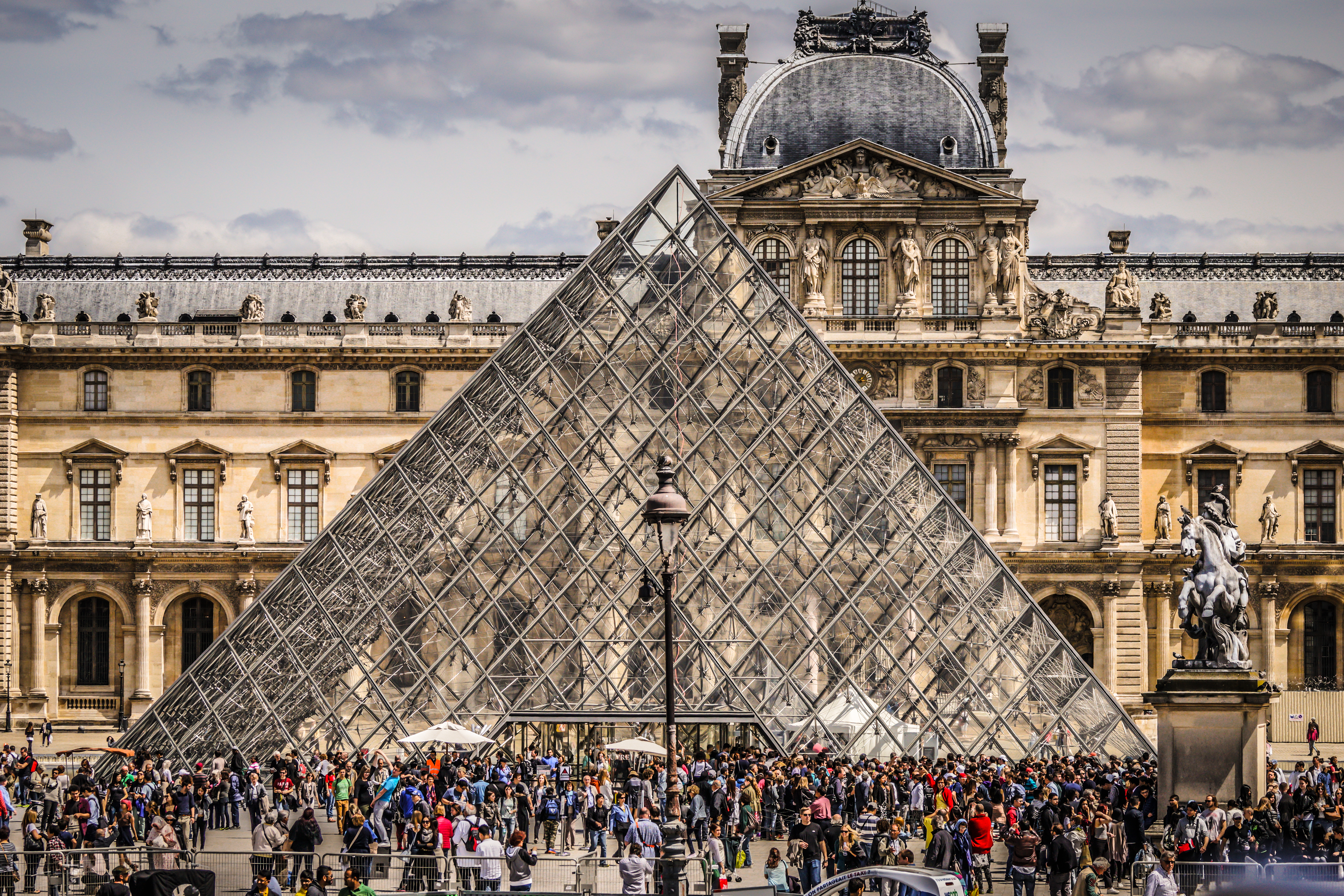 Crowds of tourists at the Louvre Pyramid – 673 panes of glass