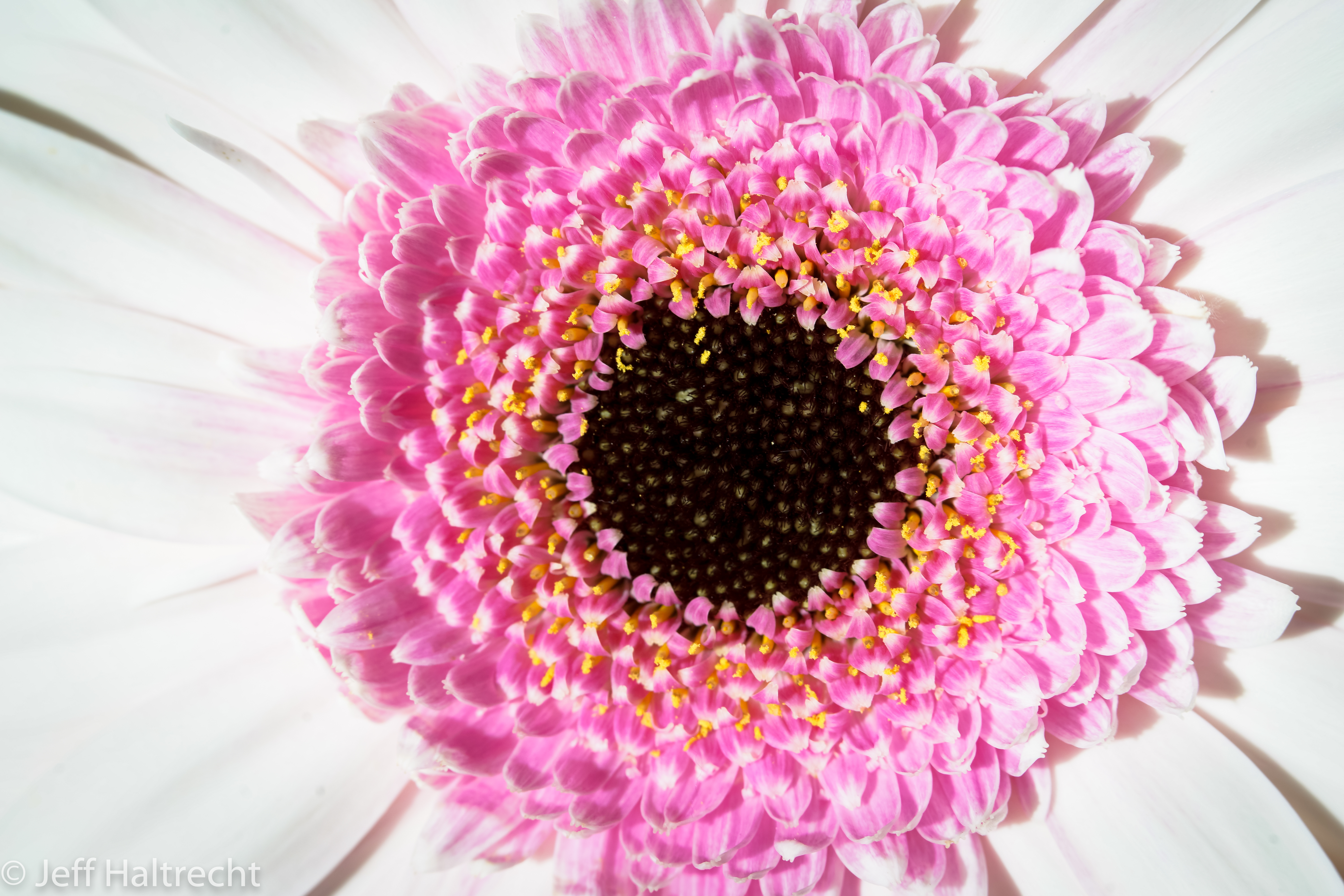 This is a macro view of a pink and white Gerbera – believe the yellow is pollen. Brought flowers home for my wife and a pair of Gerbera for the kids last fall and took some pictures. One can’t help but smile when looking at the flower, particularly in mid-winter.