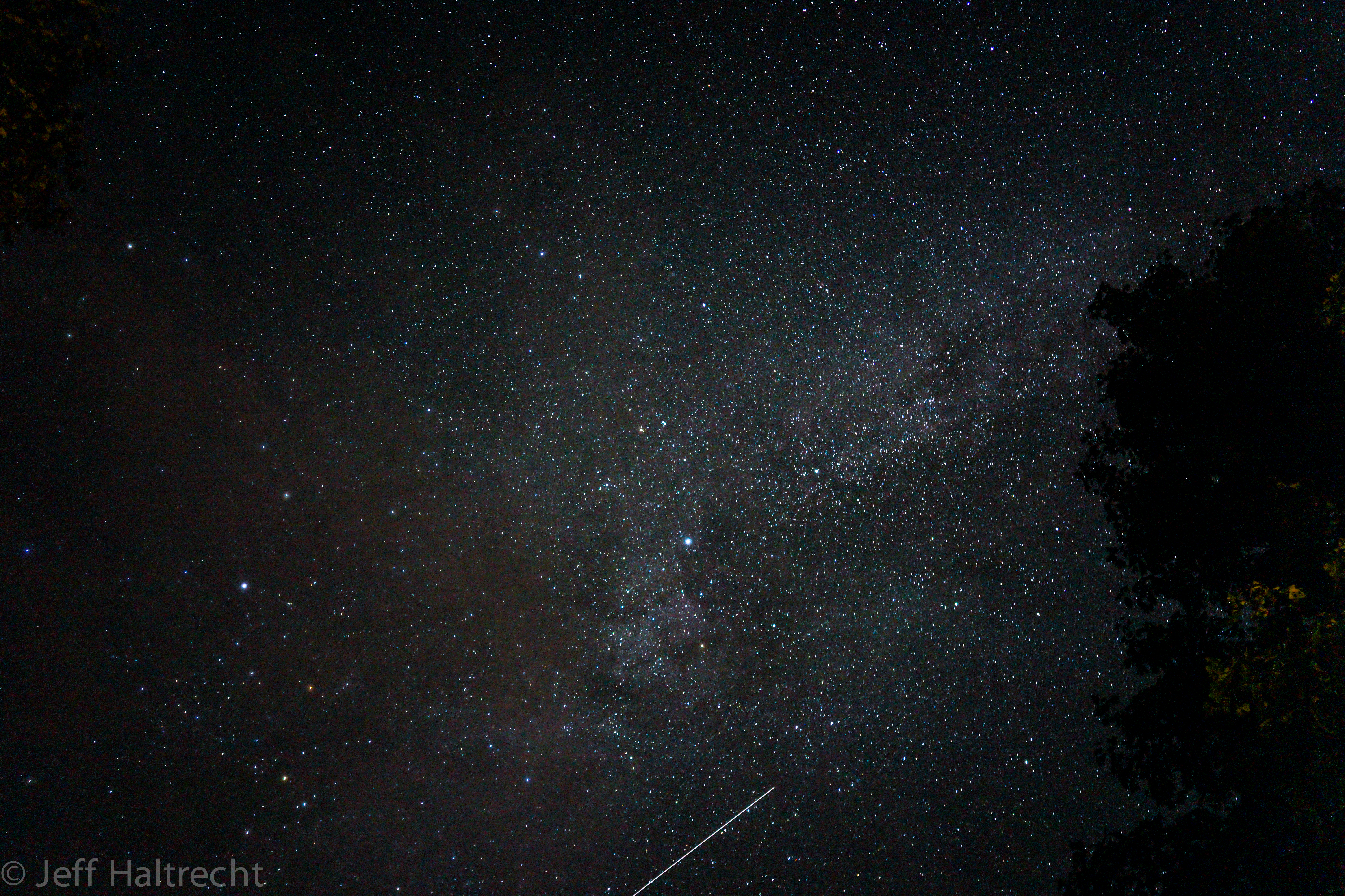Capturing a meteor shooting through the milky way from the back deck of the cottage on Grandview Lake, Muskoka. Dark outline to right are the tree tops.